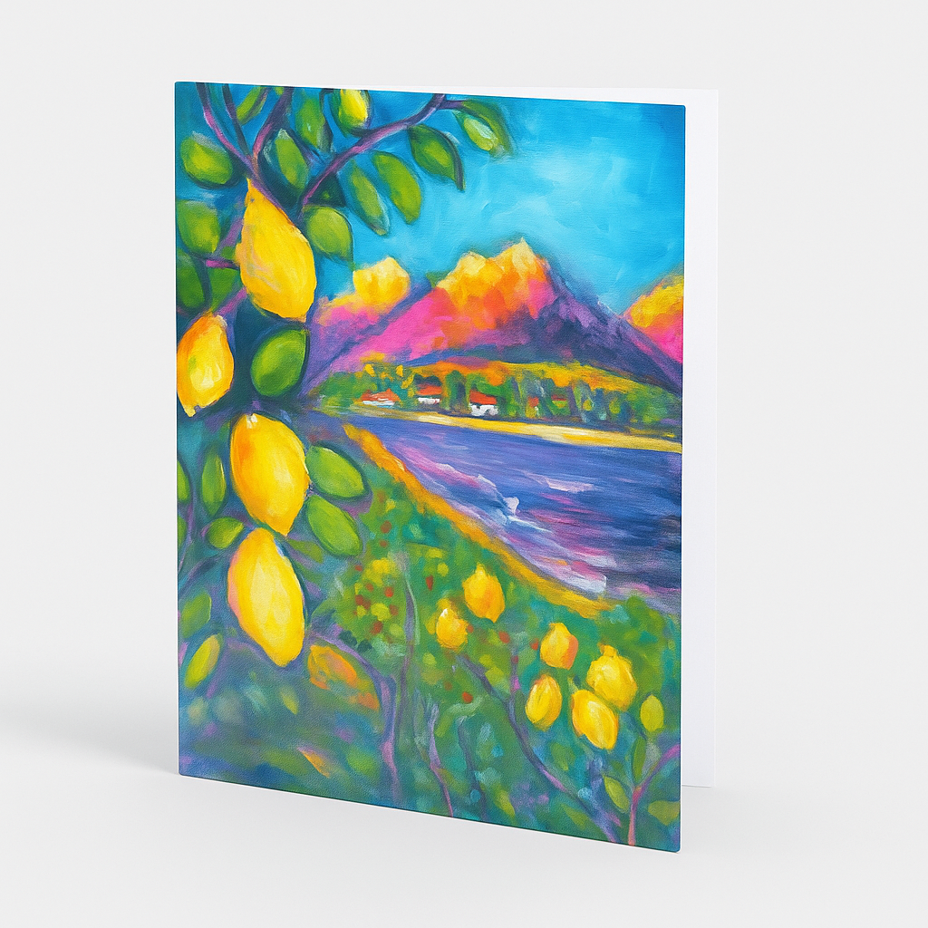 "Experience the zest of Goleta with Making Lemonade! This greeting card, inspired by the annual lemon festival, captures the vibrant energy of the event. Perfect for any occasion, this card is sure to add a burst of joy to your recipient's day. (Life's a lemon, let's make some lemonade! 🍋)"