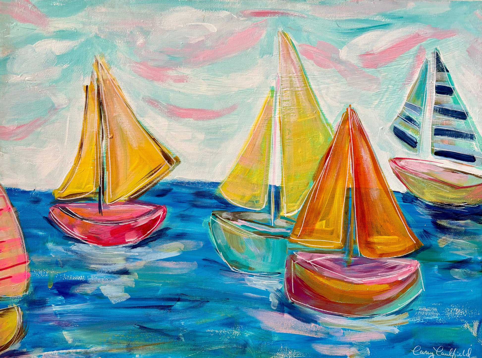 Get ready to set sail with Wet Wednesdays! This acrylic painting captures the excitement of the Sailing Races at Leadbetter in Santa Barbara. Hang it in your home and let the adventure and thrill of the ocean come to life on your walls. Ahoy matey!